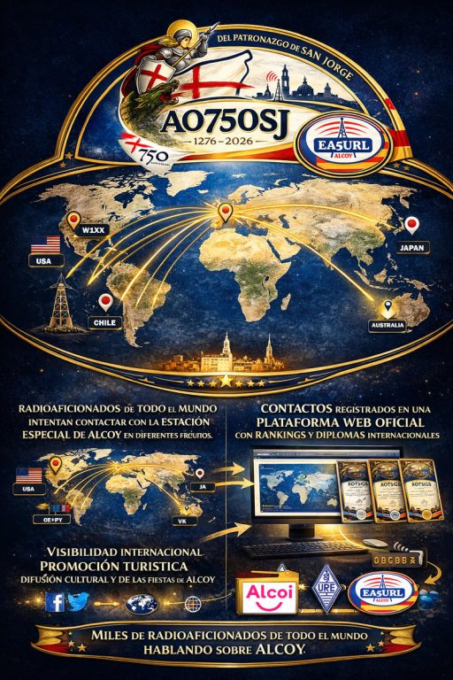 Del 6 al 26 de abril de 2026 la Sección Local de la Unión de Radioaficionados Españoles en Alcoy (EA5URL) y Radio Club Comarcal de Alcoy, pondrá en el aire la estación especial AO750SJ con motivo del 750.º Aniversario del Patronazgo de San Jorge en Alcoy, conmemoración histórica que se celebrará entre los días 6 y 26 de abril de 2026.