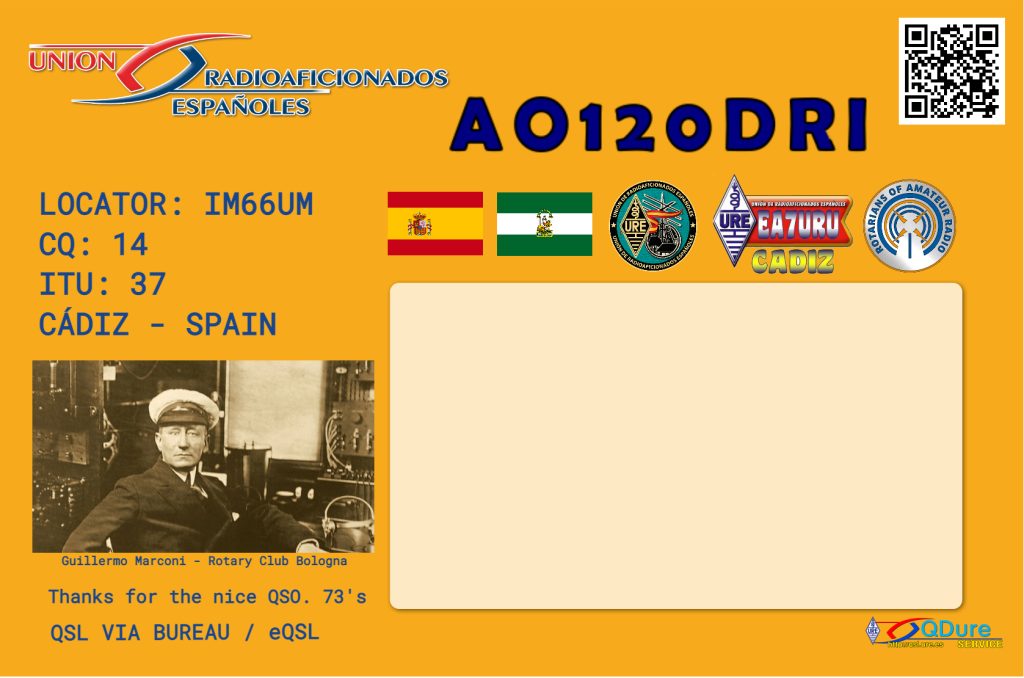 La Unión de Radioaficionados de Cádiz con la colaboración de Rotary Club Jerez Internacional, realizarán una activación especial de radio con el indicativo especial AO120DRI; para conmemorar la primera visita realizada por el “rotario”, miembro del “Club Rotary de Bologna” (Italia), y premio Nobel Guglielmo Marconi a Cádiz en el mes de Septiembre de 1902 a bordo del crucero de la Marina Italiana Carlo Alberto, el cual fondeó en la Bahía de Cádiz. Desde ese emplazamiento Marconi realizó pruebas radiotelegráficas con estaciones situadas en las Islas Británicas. Todo ello dentro de los experimentos realizados por el Nobel para el desarrollo de las comunicaciones radiotelegráficas como una tecnología válida para las comunicaciones a larga distancia entre las personas. Esta visita, quedó registrada en el Diario de Cádiz de la época, con una entrevista a Marconi en el Crucero Carlo Alberto.