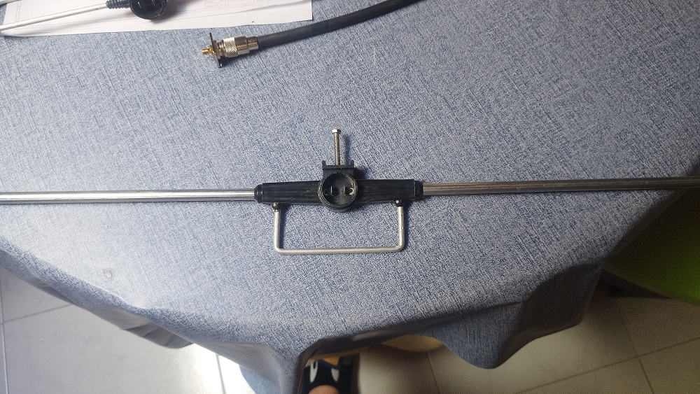 - Parece que originalmente llevaba un balun λ/4; pero puedes hacer uno sin ajustes insertando algunas ferritas -de tubo o de pinza- alineadas en el coaxial (*) tras esa conexión.