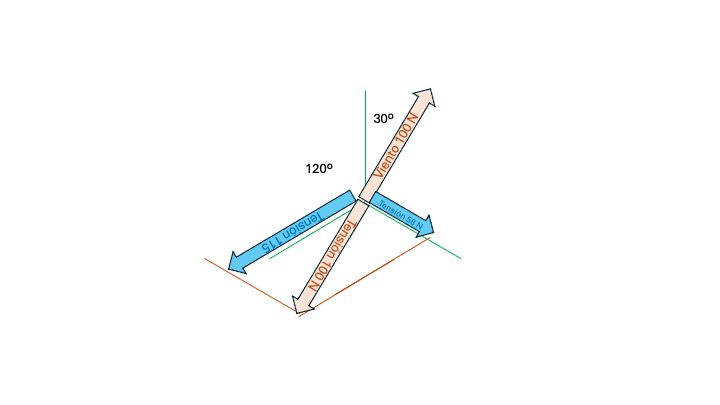Dentro de los ejemplos que comentaba al principio, se hace una asunción que en mi modesta opinión es incorrecta. Se indica que el peor caso (la máxima tensión para una riostra) es cuando el viento viene de su dirección. Pero no es el caso. En riostras regularmente distribuidas (120º), el peor caso (la máxima tensión) es cuando el viento viene do 30º (si me álgebra vectorial no me engaña). He hecho un dibujito para explicarlo (aunque como se ve, el dibujo no es mi fuerte).