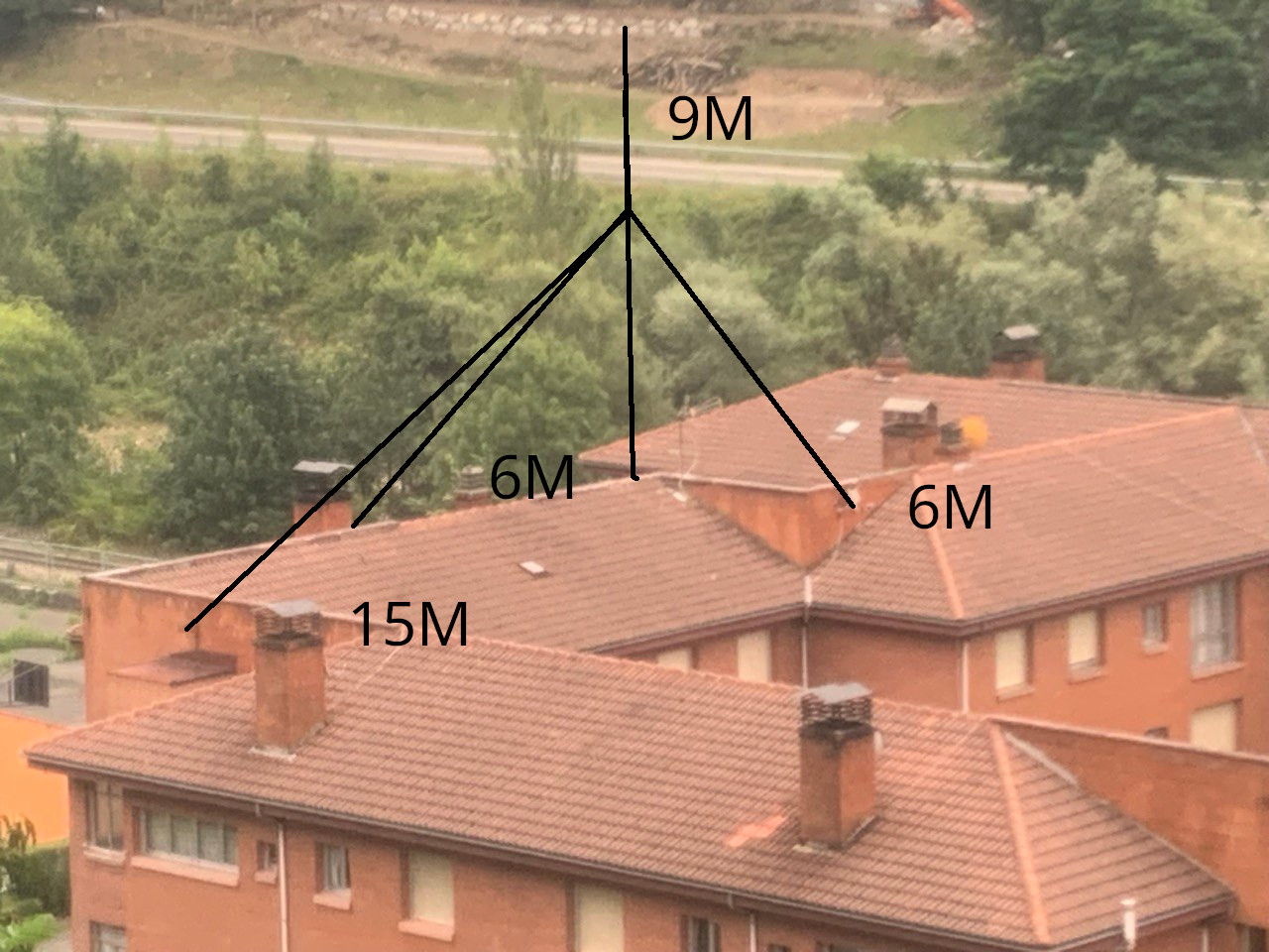 La cuestión es que he pensado en ademas de instalar la vertical en el mástil ,aprovechar y usar el viento largo de unos 15m para una segunda antena esta en sloper con instalación independiente, compartiendo solo radiales que van por los canales de las tejas.