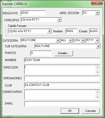 4º Esperas un poco y te saldrá una Subventana que dice cabrillo export. donde podrás rellenar los datos necesarios como, Indicativo, nombre, direccion, puntuacion, etc....una vez rellenado le das a OK.
