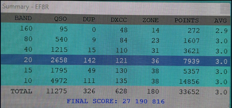 El récord anterior estaba en 25 millones de puntos como EA8BH (Op. N5TJ), y este año alcanzó los 27 millones (reclamados) como EF8R (Op. E77DX) desde la Montaña Mágica.