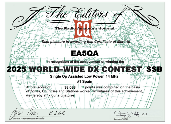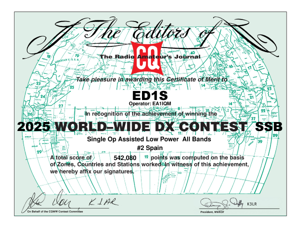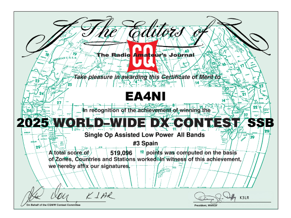 Con una vertical en TX y una Loop Horizontal Preamplificada 13dB en RX , la mejor Antena en TX , No es la mejor Antena en RX, Recepcion increíble en 160M, 80, 40 , 30, 20, 17 ,15, 12 , hay que saber ajustarla, también gane el ARRL DX CONTEST , Continental Winner , Mejor Europeo delante Gibraltar en LOW POWER .