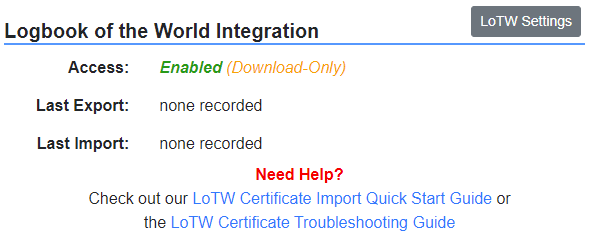 Note: Direct uploads to LoTW from QRZ Logbook is a feature which requires a QRZ subscription at the XML level or above. For subscription information, or to subscribe, see: https://ssl.qrz.com/products