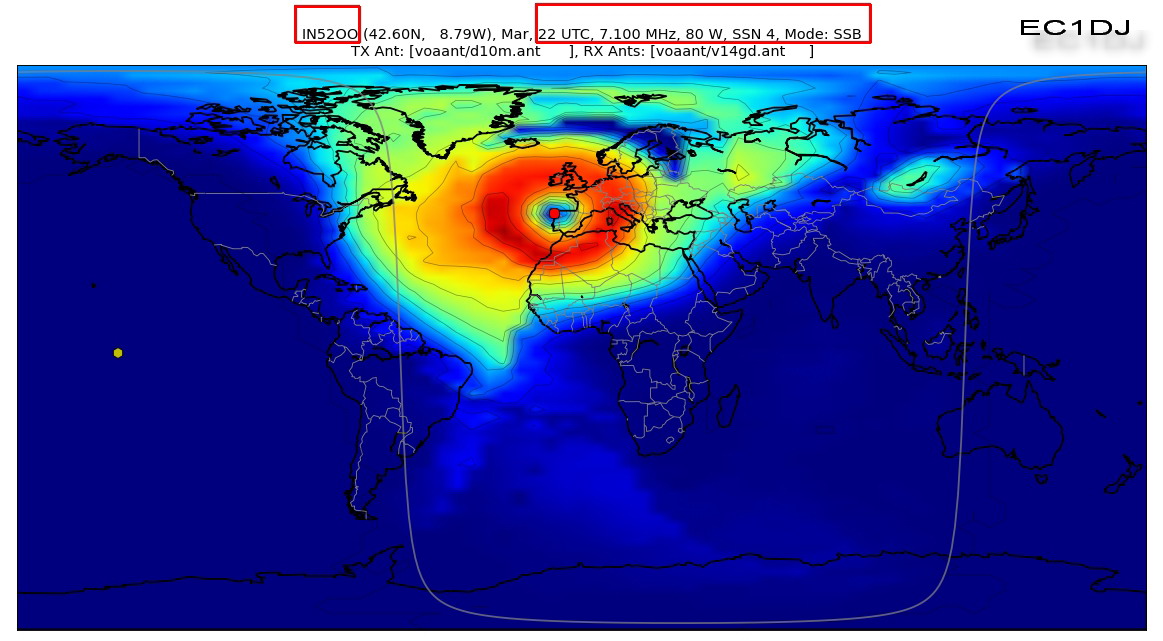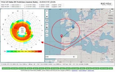 Igualmente selecciona una antena para cada banda, y selecciona también un punto en el mapa para ver a qué horas hay más probabilidades de contacto (en porcentaje), en este caso París. Cuando pulsas sobre "Prop Wheel" te muestra una rueda en la que cada cuadrícula corresponde a una hora (UTC) y una banda (concéntricas). De este modo puedes saber (por ejemplo), qué horas del día y en qué banda es más probable el contacto con cualquier lugar del mundo.