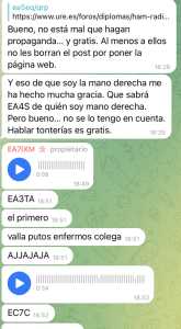 Quiero contestar públicamente por aquí a ea5eq. Este señor fue quien filtró la existencia de este hilo al propietario, así pone en su grupo de Telegram con la intención de que nos insultaran. Así se hizo. No ha dicho ni pio por aquí pero en dicho grupo se ha venido arriba con sus intervenciones, ahora solamente falta que sea cierto lo que dice. Solamente le voy a contestar por aquí a un comentario que hace. Este es el comentario del felón:”
