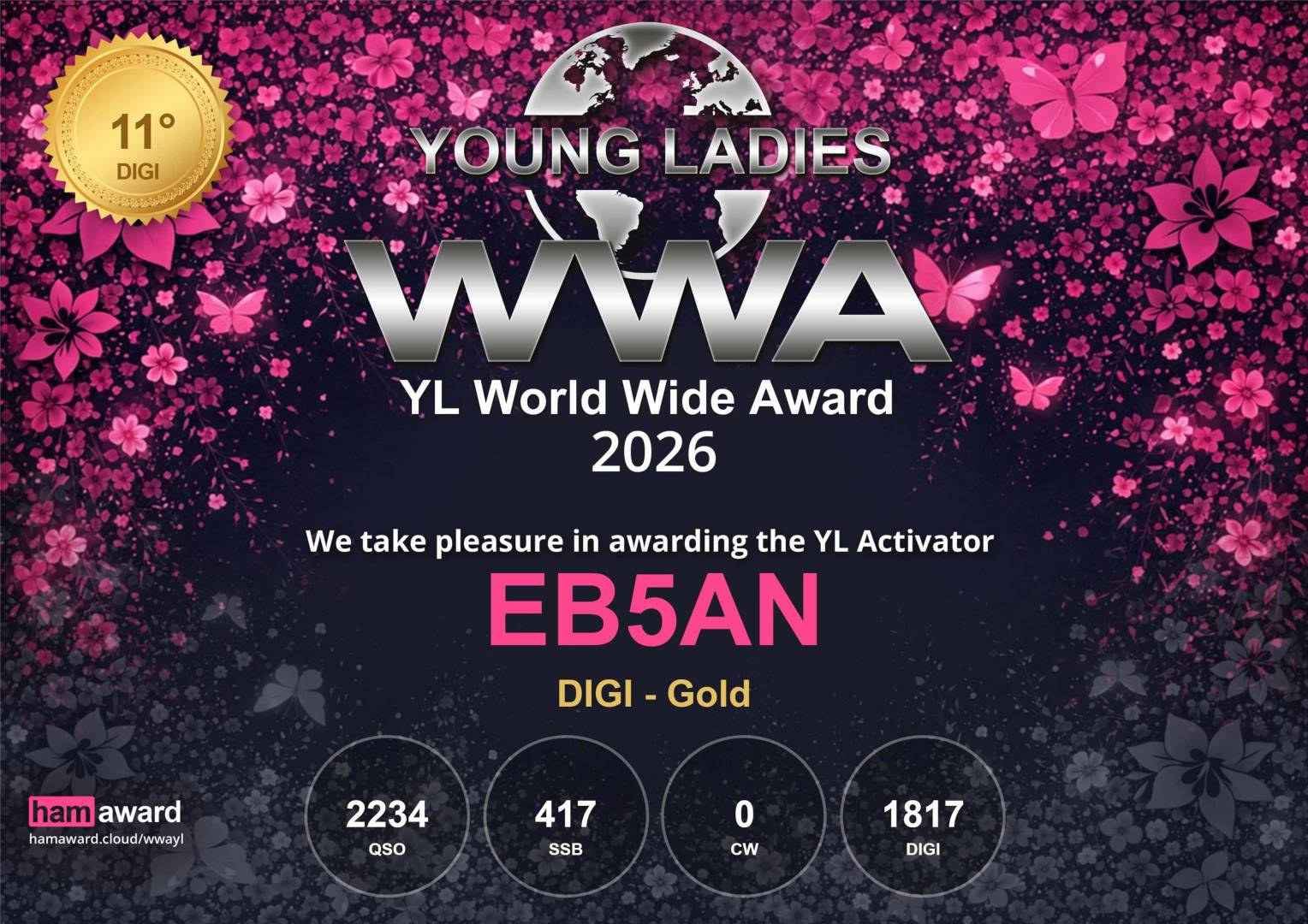 Para obtener el PREMIO YL-WWA 2026, se requiere un mínimo de 100 puntos, dentro de los plazos y métodos indicados en estas bases. La entrega del premio es gratuita y no requiere QSL en papel ni confirmaciones de QSO. El premio se entrega descargando el archivo digital, en formato A4 de alta resolución, sin registro, a través de la plataforma hamaward.cloud o las páginas de qrz.com, al finalizar el premio. La descarga de eQSL estará disponible en Hamaward.cloud. No es necesario enviar el registro ni la QSL.