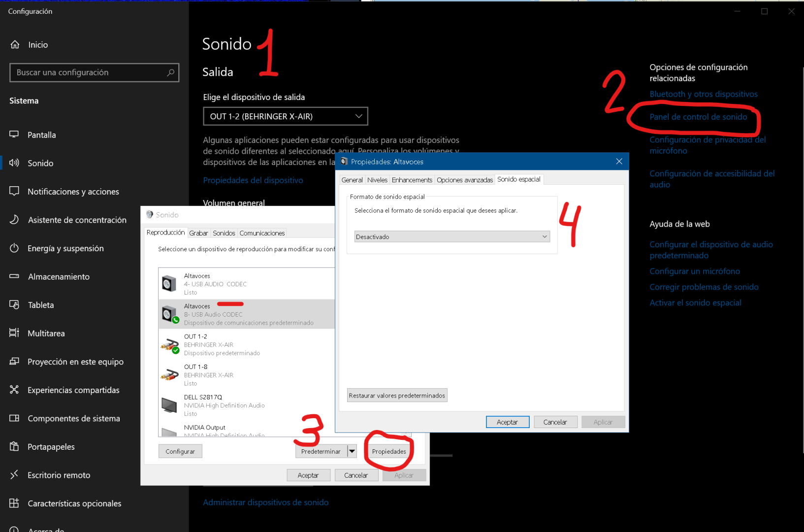 De todas formas, eso del "sonido espacial" es para reproducir, esto en Windows significa salida de audio. Tu problema es con la entrada, en Windows "Grabar", en la segunda ventana, pestañas de arriba.