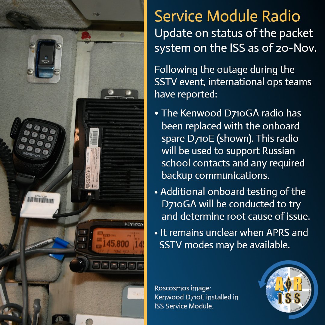la ISS tiene ahora mismo activo el PACKET y el repetidor de banda cruzada, subida 145.990 con subtono de 67.0 hz y bajada 437.800 mas/menos doppler.
