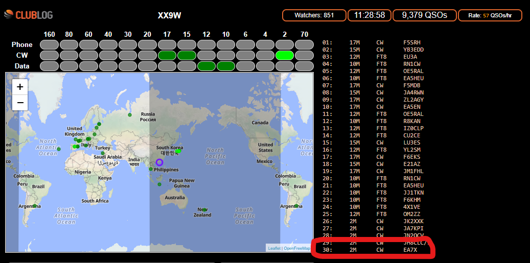¡Esto es una TRAMPA en toda regla!. EA7X es un miembro de esa expedición y se acaba de meter en el log de XX9W como si hubiera hecho este contacto por satélite LEO cuando ES IMPOSIBLE trabajar XX9 desde EA en satélite LEO. Si fuera el QO-100 si, obviamente. Y mucho menos que lo haga un miembro de esa expedición.