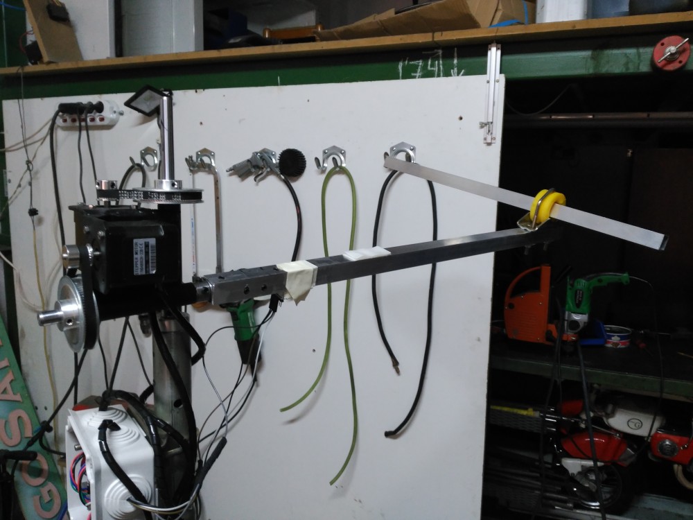 El segundo elemento es un rotor autoconstruido. Me he basado en el proyecto SatNOGS aunque es de construcción libre. He utilizado un par de motores paso a paso 17HD48002H-22B movidos por poleas de goma, un Arduino Uno, una controladora CNC Shield, dos drivers para los motores tipo DRV8825 y le he añadido un sensor LSM303DLHC (un chip con funciones de magnetómetro, entre otras) para intentar posicionar el rotor a cero al iniciar sin tener que averiguar dónde está el N magnético.