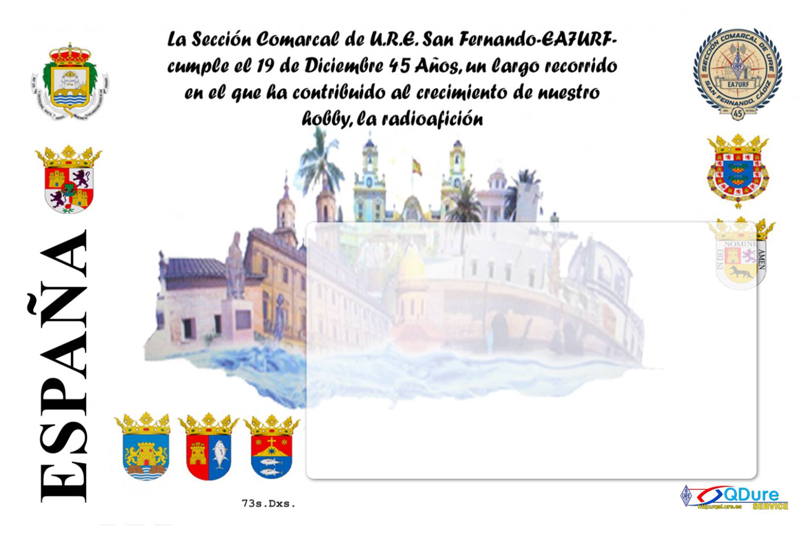 Aqui tenemos la QSL especial del evento ya terminada que ha sido encargada al QDURE, por lo tanto, la recibirán vía URE todos los socios que hayan contactado con EG45URF.