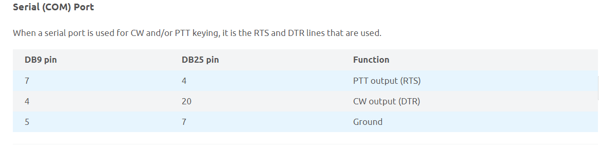 Con las conexiones 7 a masa y 20 (DTR) a la base del transistor de manipulación (en un conector hembra) tienes una manipulación por puerta serie.