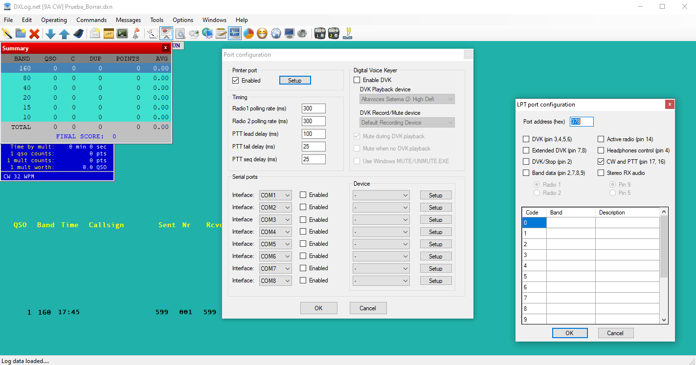 Muy interesante el tema. Yo hace poco he vuelto a poner en marcha mi equipo para digitales (con un interface RigExpert, pero es otra historia distinta). Si he comprendido bien tienes un interface sencillo para CW por puerto paralelo. Y quieres realizar la manipulación mediante software que además tenga log, creo que has puesto dxlog.net.