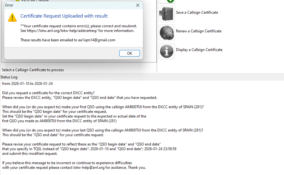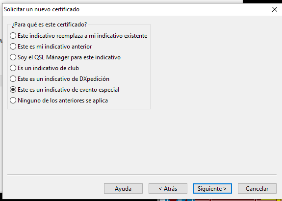 Entonces entiendo que eso te aparece al final del todo cuando le pones la dirección de correo electrónico y subes la petición, ¿no? pues la verdad no entiendo nada. Una cosa importante: tienes tu certificado para el EA1IQM instalado correctamente? porque sin tu certificado no vas a poder pedir otro como evento. Ya que el tuyo se usa para firmar la petición.