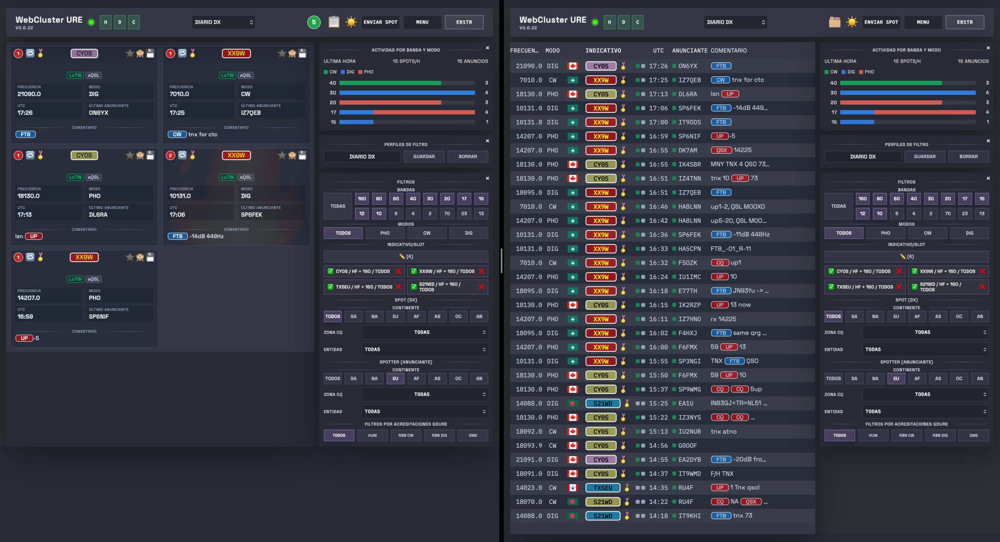 - Nuevo módulo en el carril derecho de Actividad por banda y modo.