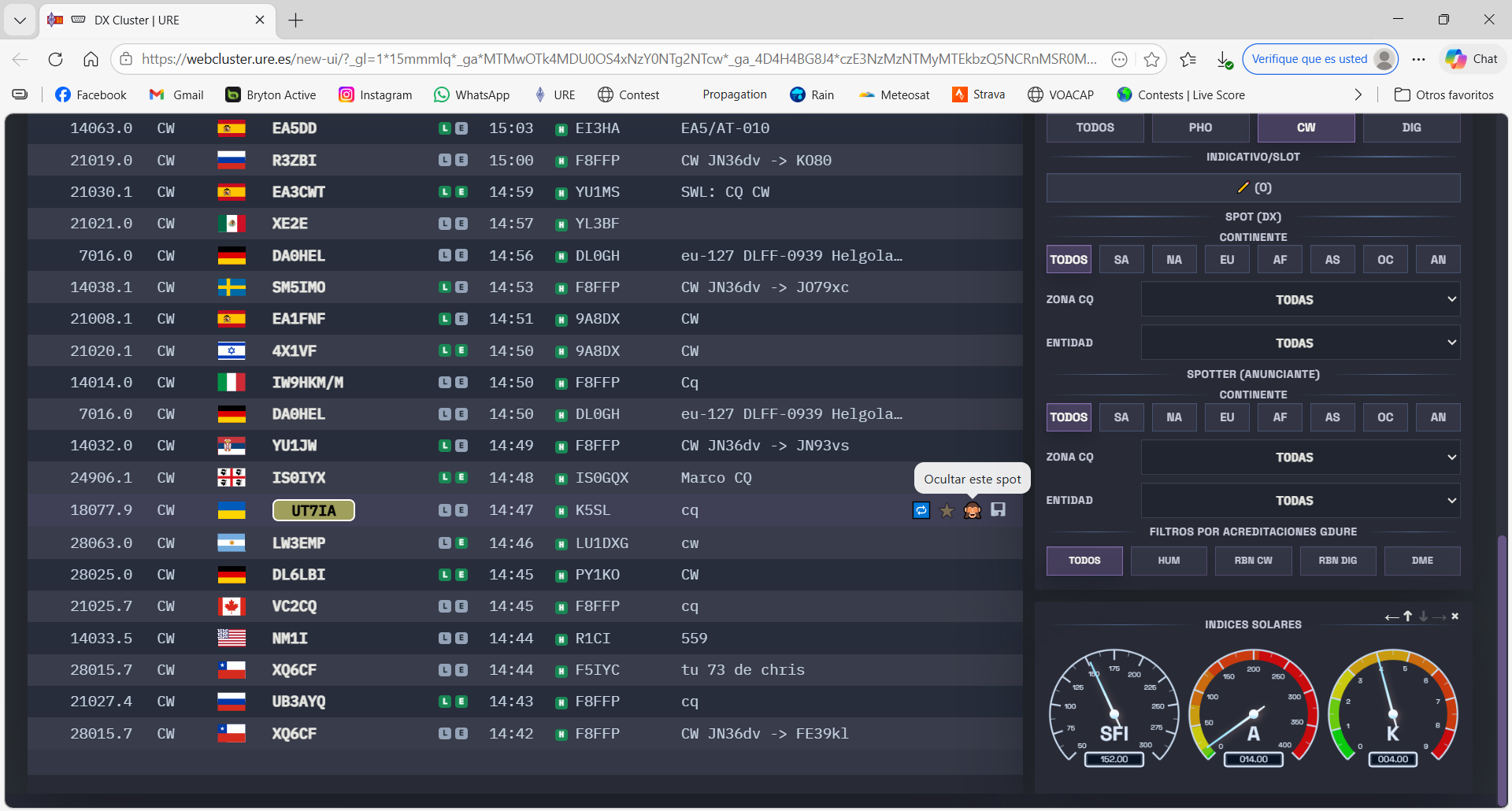 Es curioso, este spot como no trabaja ni Lotw ni eQSL, no me interesa. Pues le doy al "monito" para ocultar, lo oculta y vuelve a salir y vuelve, no se oculta. jejejejeje