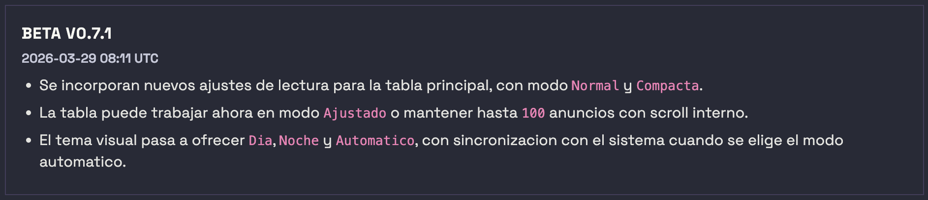 Como sugerecnia quizás podría ser útil, si el coste de implementarlo no fuera costoso, incorporar algún boton las vistas de TABLA DE SPOTS y en AGREGADOS que borrara el contenido de las mismas. Creo que sería útil para facilitar la comprobación de los filtros u opciones que vayamos a utilizar.