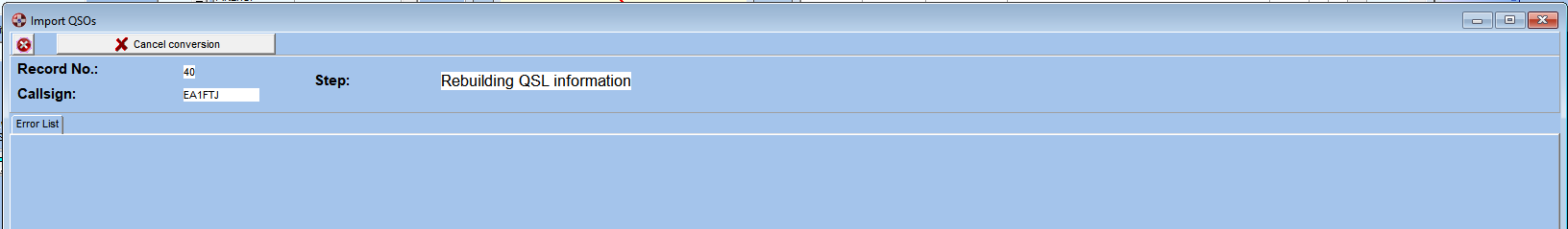 El proceso de importación acaba con un mensaje informando que la conversión ha finalizado con éxito. Sin embargo, alguna vez muy ocasional me he encontrado con el mismo caso que explicas que no aparece ese mensaje después de reconstruir la información de QSL. Pero no sé porqué sucede eso y no puedo depurarlo porque para eso tengo que poder reproducirlo. Si a ti siempre te sucede esto al importar un fichero ADIF, envíame tu base de datos y el fichero ADIF que estás importando. De este modo lo probaré yo aquí a ver si me sucede lo mismo y entonces podría mirar de arreglarlo.
