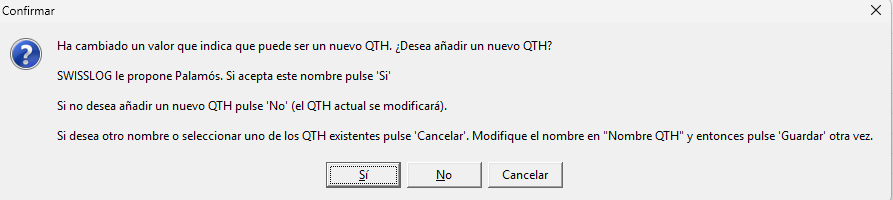 Hay que contestar que SI, que añada un nuevo QTH con el nombre propuesto. Si pulsas NO, reemplaza el QTH existente, Por tanto, asignando esa nueva referencia a todos los QSO anteriores que tengan asignado ese Nombre-QTH.