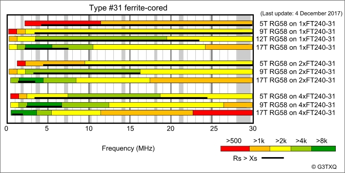 G3TXQ en la tabla para el material #31 que publica en su trabajo Common-mode chokes indica las lecturas que se pueden obtener con 17 vueltas de RG58 sobre un toroide FT240-31 y son coherentes con las obtenidas con la nanoVNA.