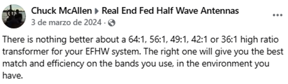 Para su sistema EFHW, no hay nada mejor que un transformador de alta relación de 64:1, 56:1, 49:1, 42:1 o 36:1. El adecuado le proporcionará la mejor adaptación y eficiencia en las bandas que utiliza, en el entorno en el que se encuentra.