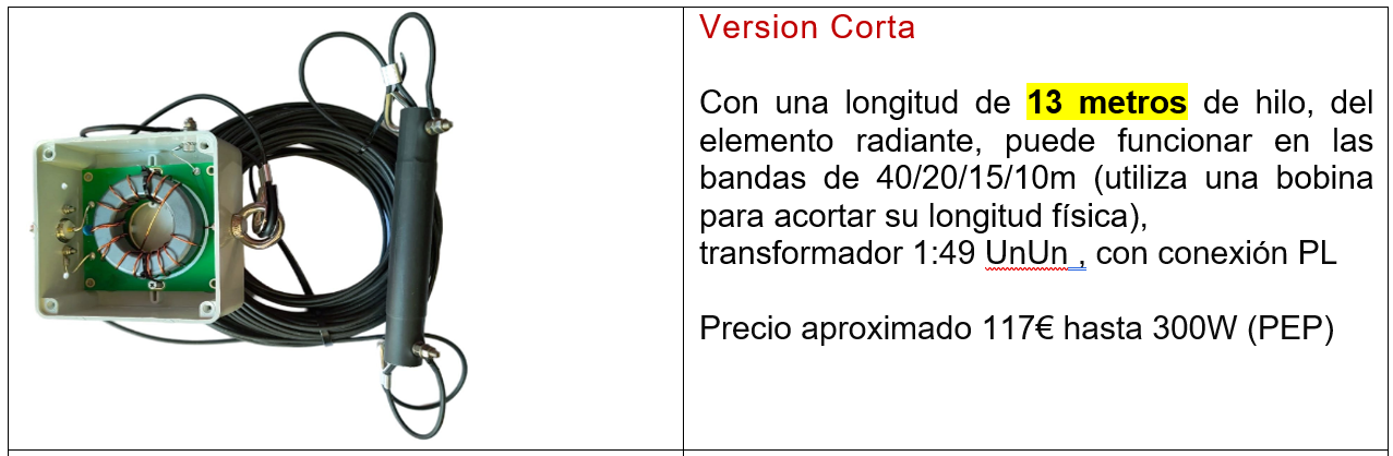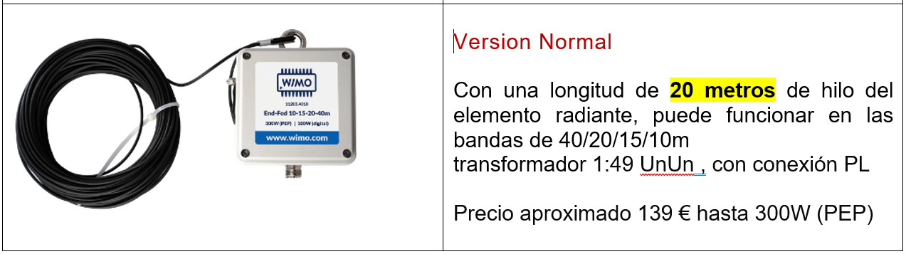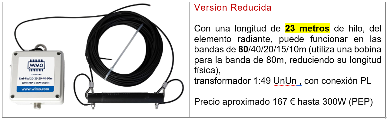 - La antena EFHW (End Fed Half Wave Antennas) es una antena similar a un hilo largo y resonante de media onda, alimentada en un extremo, utilizando un transformador de impedancia UnUn "unbalanced-to-unbalanced" (no balanceado a no balanceado), que dependiendo de su altura con respecto al suelo y otros valores, puede ser necesario una adaptación o transformación de diferentes impedancias de 64:1 , 49:1 , 36:1 aproximadamente entre 1800 a 5000 ohmios) para adaptar la alta impedancia del hilo a los 50 Ω del cable coaxial.