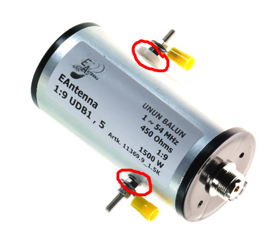 - Si la vista no me engaña, un terminal del balun ya está a masa, y el otro parece aislado. Si eso es así, pues está claro, antena al aislado, y tierra a la masa.