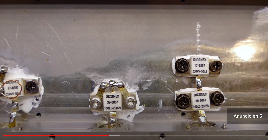 Y para EA3EUL con relación a las resistencias de carbon, a no ser que te refieras a las de película de carbón con ajuste con laser de tipo helicoidal, para conseguir una resistencia equivalente que aguante tanta potencia deberías montar un montón de ellas -normalmente no se encuentran de más de 3 W, a no ser que sean de valores raros- y la respuesta empezaría a degradarse por encima de 30 MHz si no es antes. Las antiguas de "composite" de carbón son casi inencontrables, y con el paso de los años cambia su resistencia. Esto les está pasando a muchos órganos electrónicos de los años 60 y 70...