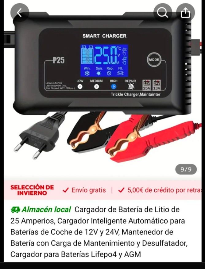 El cargador de 25 Amp (12/24 V.) SMART CHARGER P25, comprado en TEMU: