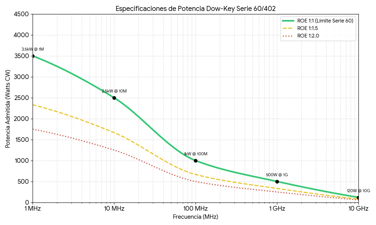 Al no ser de 50 ohm. esto puede reducirse un poco (30 Mhz.) ya que la intensidad de RF es superior, y los contactos de los relés suelen calentarse por intensidad... pero eso siendo idealista respecto a la impedancia del sistema.