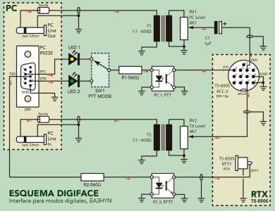 La clave es siempre la misma: transformadores de audio para aislar la "zona radio" de la "zona ordenador", sacar del RS232 la señal de PTT (con optoacoplador, también para aislar ambas "zonas") y muy aconsejables los potenciómetros, para regular la intensidad de los niveles de señal de manera "hardware" y que estos sean siempre los idóneos.