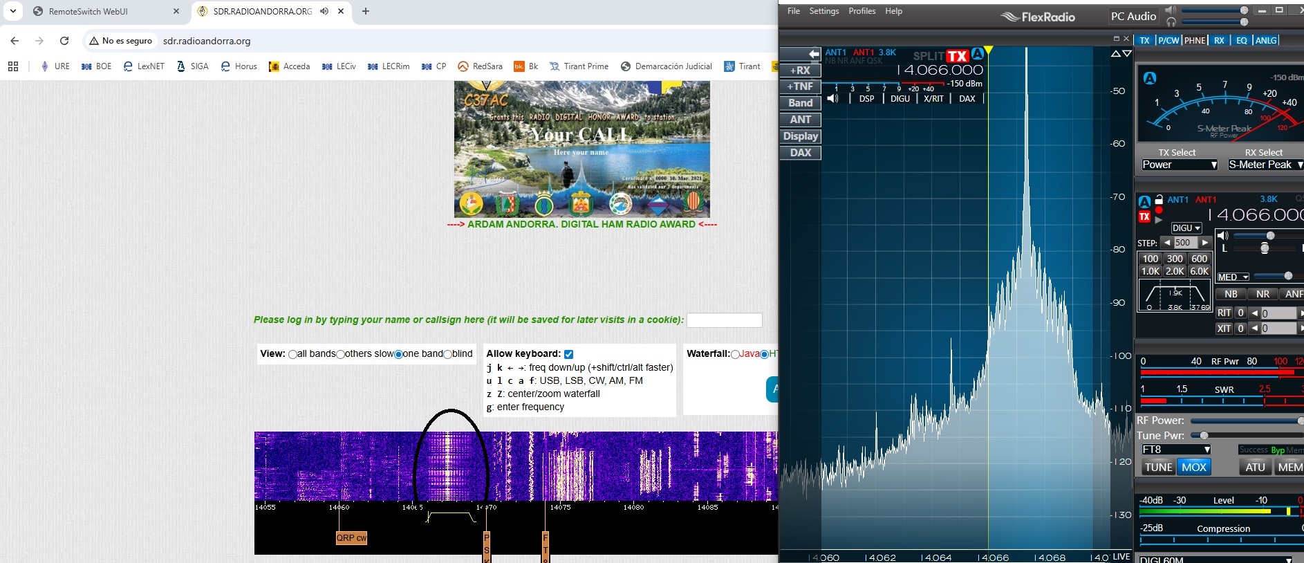 He hecho la prueba y he puesto a transmitir el Flex en 14.066 y lo escucho en el sdr de Andorra y el sonio es el mismo y la imagen es la que adjunto (se utilizó solo el tono TX del wsjt)