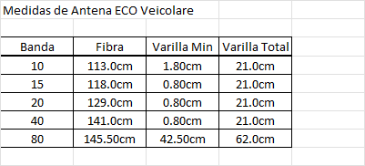 No he encontrado en internet las medidas que busco de las antenas ECO ANTENNE VEHICOLARE (La marca original italiana ya no existe). Necesito saber la longitud de cada Whip monobanda de todas las bandas de HF que tenían y la longitud de cada varilla de ajuste. Y ya por preguntar, el grueso de todos los Whips, me refiero a la varilla de fibra de vidrio en donde se bobinaba el hilo en espiral, no la medida de la varilla mas el hilo, solo el soporte, era el mismo? yo creo recordar que si (también sería interesante saber esta medida). Un colega me ha pedido esta información y no la he encontrado en internet, a ver si alguien las tiene todas y me puede pasar la información.