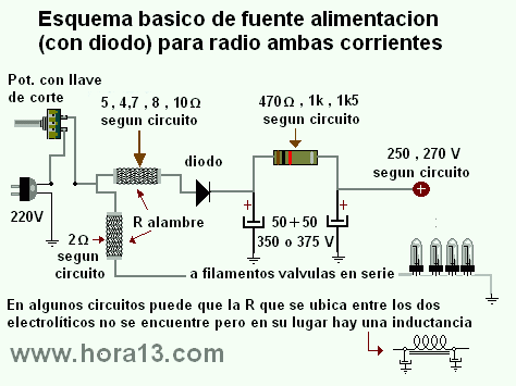 Muchas gracias EA1AWY; voy a intentar buscar esta ingeniosa solución por Internet y en cuanto tenga todos los componentes os comentare la diferencia que hay de colocar la resistencia o la del trasformador; actualmente la radio funciona, pero en el momento que sintoniza una emisora el rizado de la fuente se mezcla con la emisión, le puedo reducir el ruido recortando la longitud de antena, pero deja de ser selectiva; también estoy valorando sustituir la lampara rectificadora por un puente de diodos, pero no me queda muy claro como eliminar esta lampara; voy a intentar poner un esquema de la lampara que he encontrado por Internet.