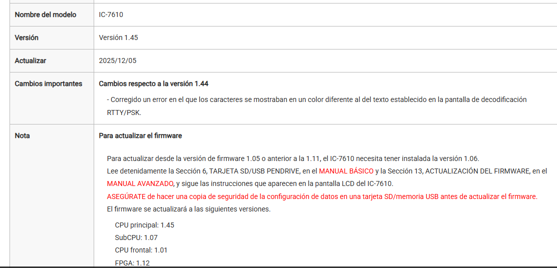 Puedes asegurarte de tener el último firmware descargándolo desde la página oficial de ICOM para el IC-7610: ICOM Firmware Download.