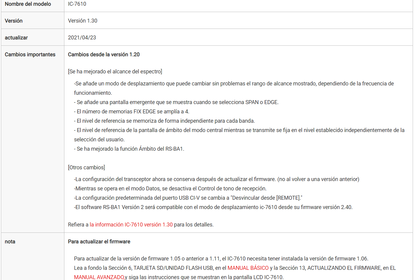 Ya esta disponible la actualización del Firmware 1.30 para nuestras IC-7610