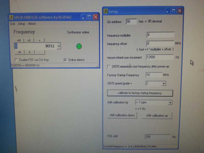 Por lo tanto cabe deducir que aunque sea un oscilador de frecuencia variable incluye un cristal que según los manuales oscila 15 MHz y que en la práctica hay otros Si570 cuyo cristal de frecuencia fija oscila a 56,32. Dicho esto, también se puede deducir (sin haberlo comprobado) que el software que pilota el Si570 el USB_Synth.exe debe conocer la frecuencia fija del cristal y que este dato lo debería incorporar por el "ajuste de fábrica".