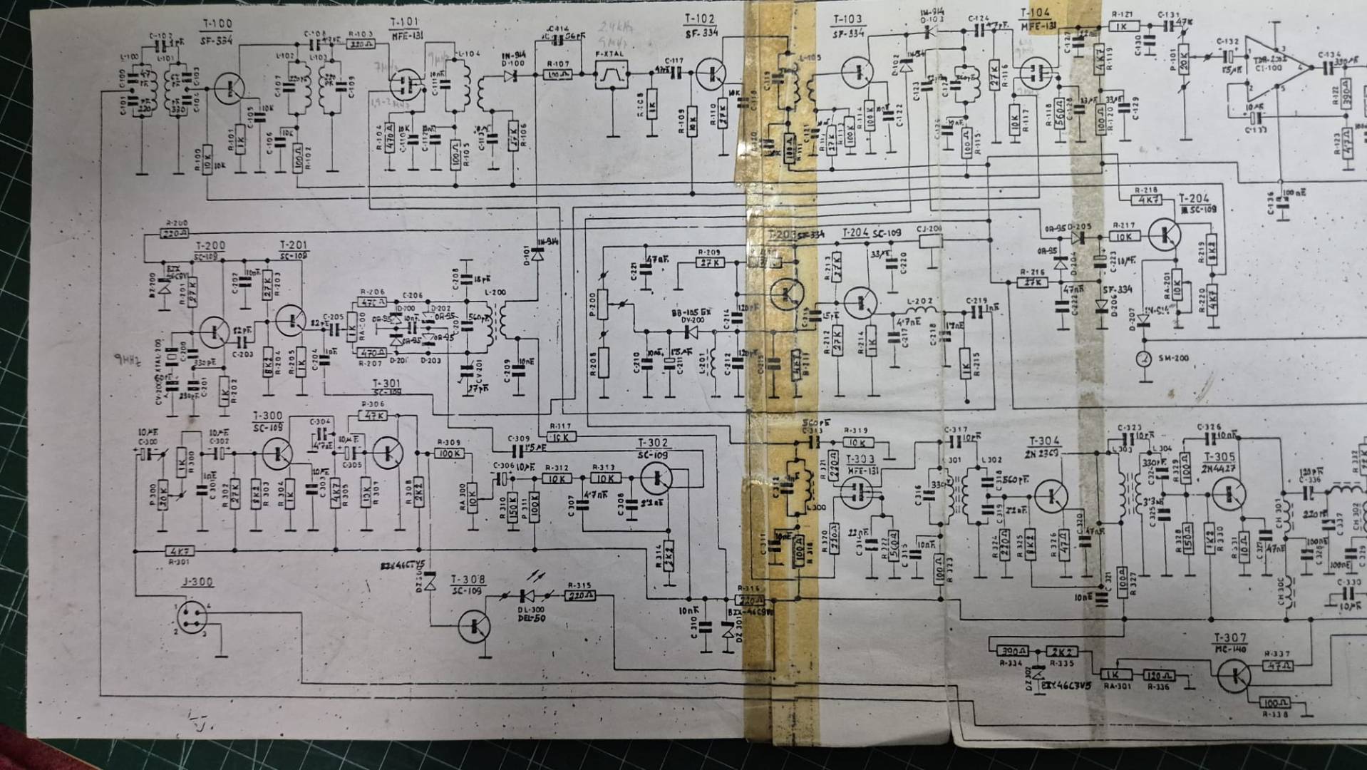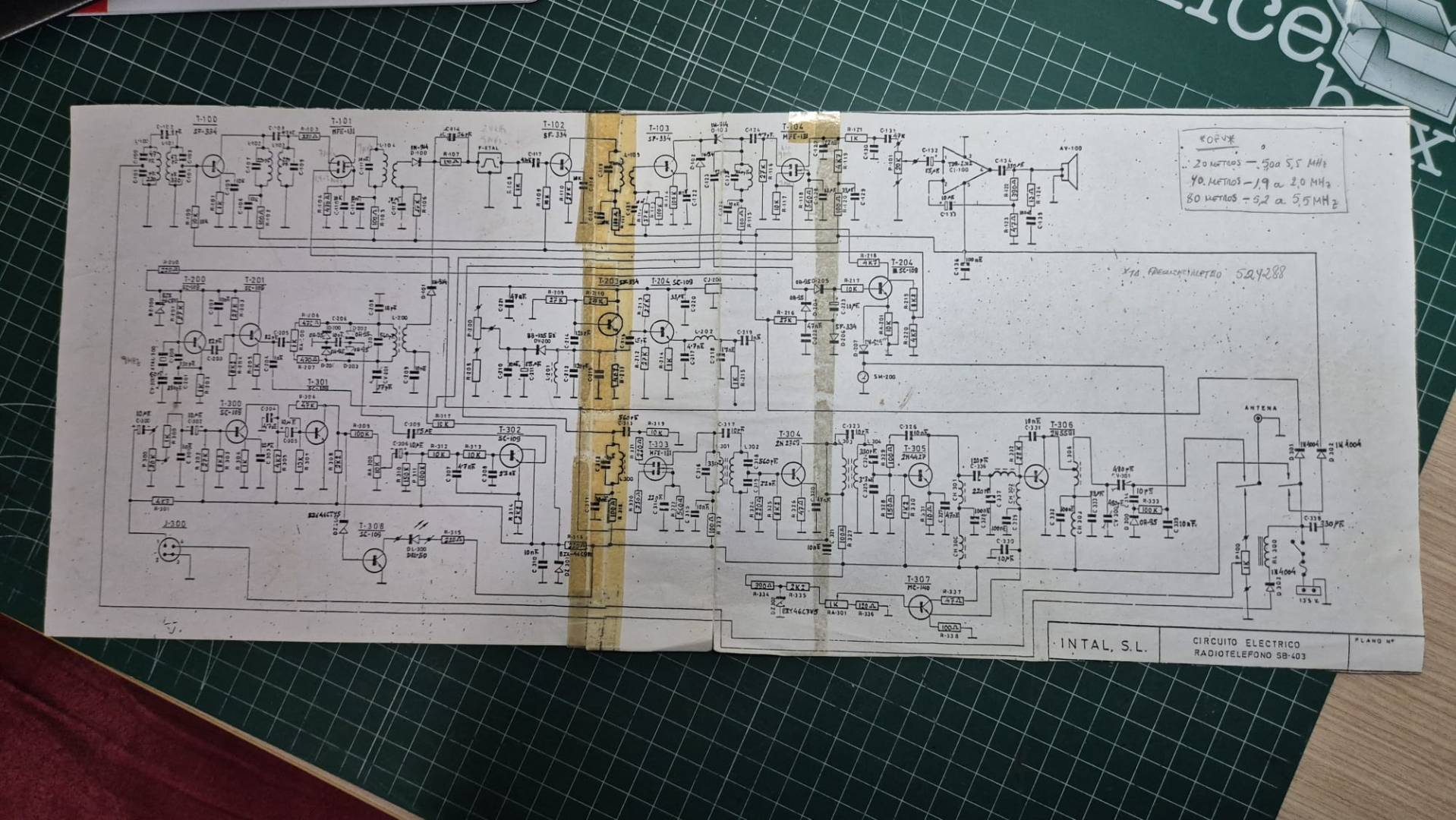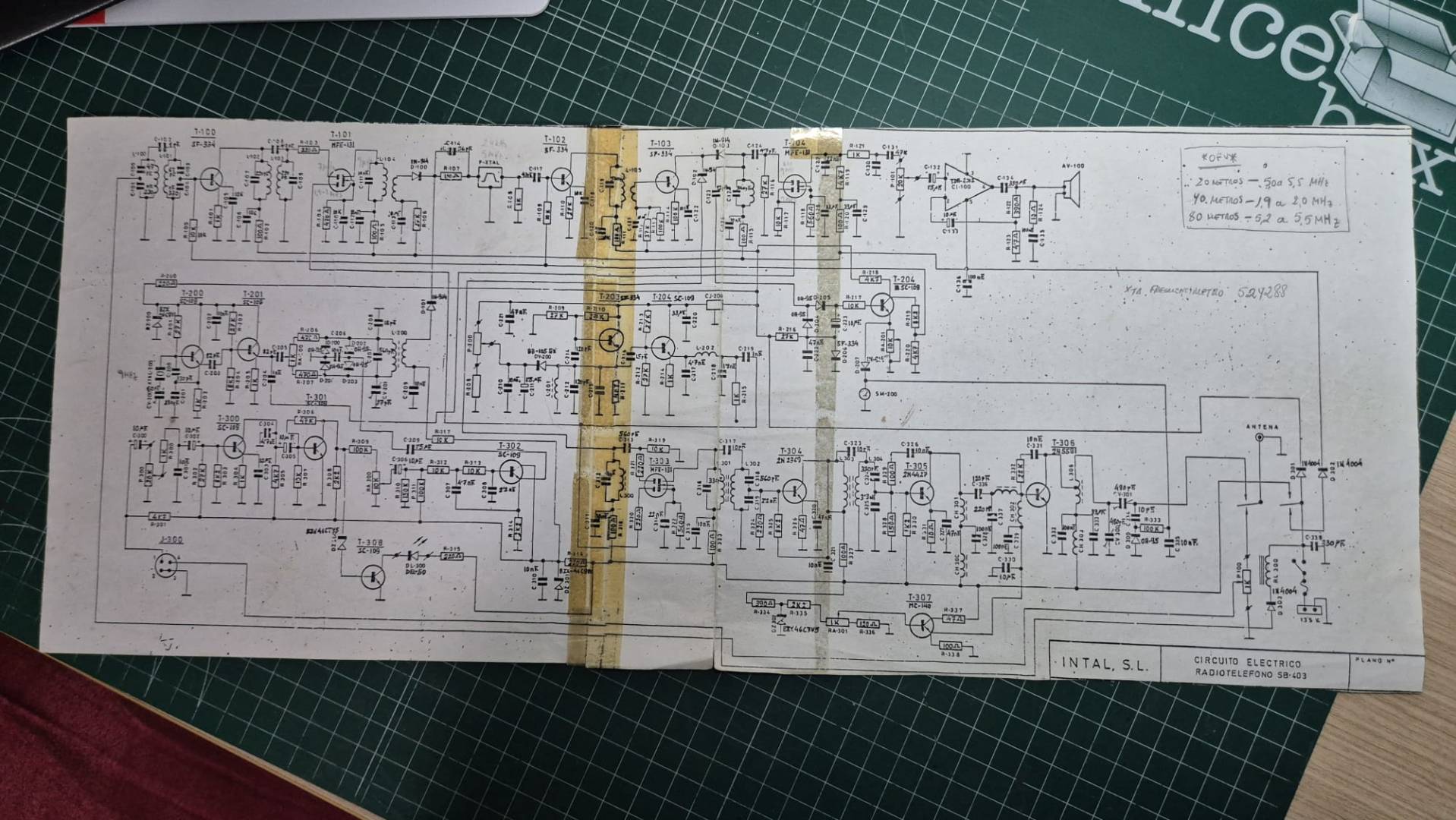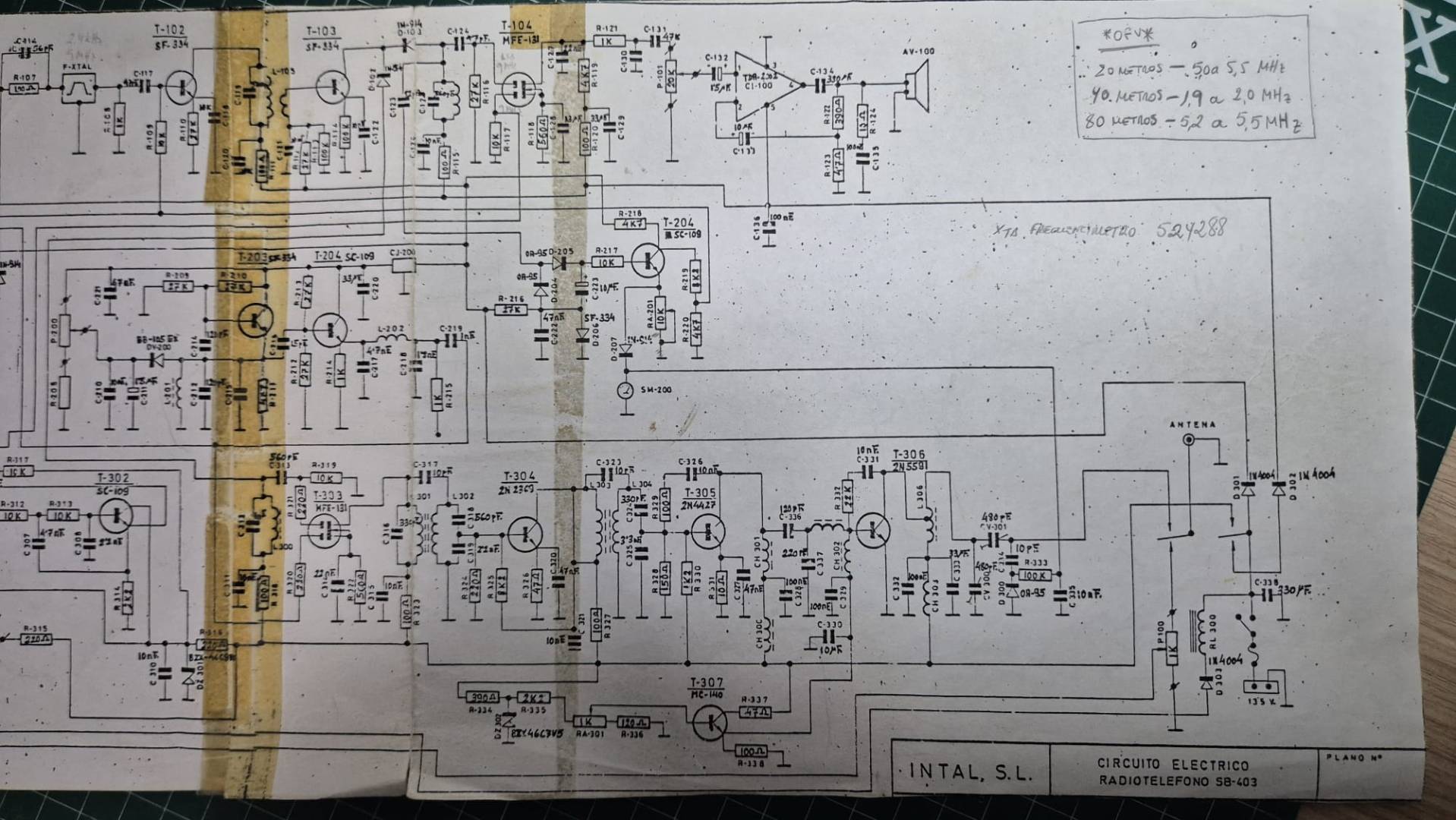 Que la I.A. haya quitado las marcas del celo no hace que sea mejor. Un par de ejemplos: el nombre del integrado amplificador de audio en la esquina superior derecha y la inscripción a mano junto al cable del positivo que alimenta al mismo. Miré primero primero el esquema "regenerado" y no conseguí distinguir lo que ponía, mientras en el "original" se ve que pone "TDA2002" y "FRECUENCÍMETRO".