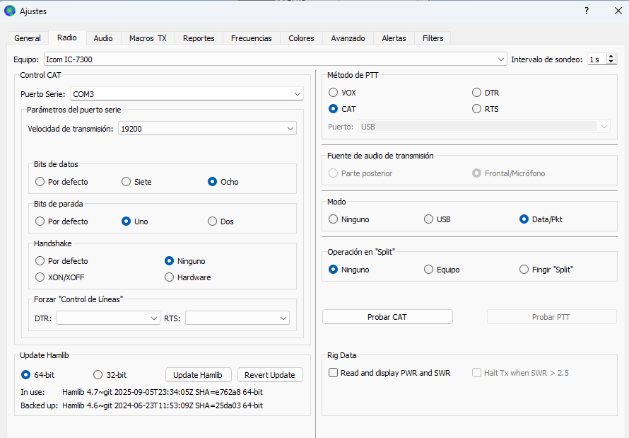 Con el nuevo Ic-7300 MK2, lo único que modifico es el puerto en serie que en el caso de este nuevo equipo a creado en el PC los puertos COM5 y COM6, lo he probado con los dos. La configuración de los dos equipos he puesto la misma ("a priori").