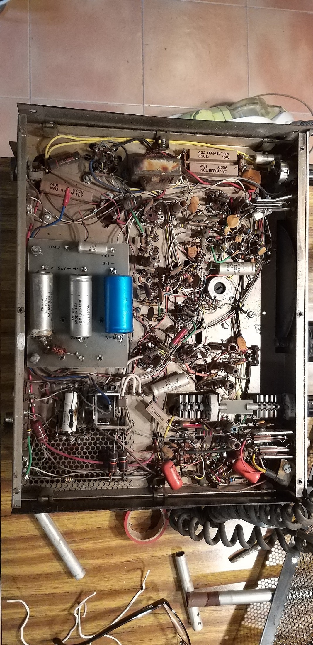 Hola de nuevo, bueno por lo que veo en la foto, lo han tocado un poco, los condensadores que ves cortados, son los de filtrado de la fuente, y son imprescindibles para que el equipo funcione perfectamente, sin ellos temdras zumbido de componente alterna (50HZ). lo mismo lo usaban con una fuente externa. el resto veo resistencias de masa carbonica, es posible que esten algo variadas, por lo tanto habria que revisarlas, y la que este mal cambiarla, tambien el tema de valvulas, y por ultimo un alineado.es decir, mas que a una pequeña reparacion, es una restauracion lo que necesita ese equipo. yo si fuese tu lo intentaba, a ratos libres.y sin prisa, no es un equipo complejo, en su manual tienes el esquema, de bastante calidad. si quieres mandarme mas fotos, no hay problema, mi mail es: electronicavalvulas@gmail.com. un cordial saludo EA5IMJ