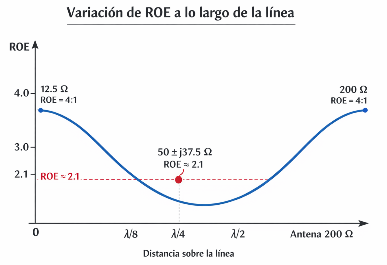 Cuando calculamos un punto intermedio como Z = 50 + j37.5 Ω, y luego hacemos ROE “respecto a 50 Ω”, eso ya no es la ROE de la línea, sino de un transmisor conectado allí como si fuera una carga aislada.