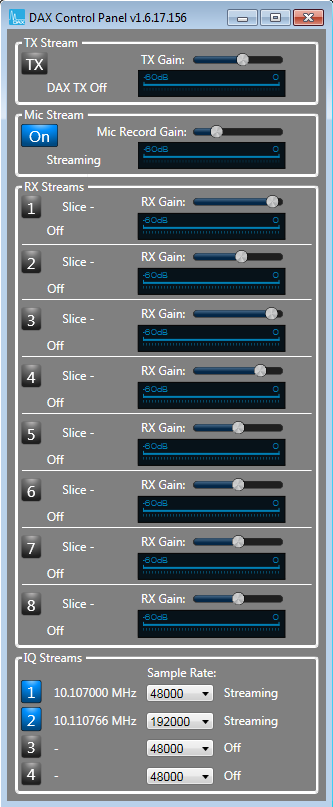 SmartSDR DAX, es el intercambiador de sonido e IQ de los Flex. En las generaciones anteriores (1500, 3000, 5000) se utilizaban "cables de audio virtuales" que podías crear con software ajeno a Flex. DAX, incluido en el paquete de instalación del software SmartSDR, simplifica este proceso y nos permite controlar el volumen de cada Corte/VFO (Slice), el ancho de los canales IQ, el volumen de la entrada digital de cada corte, el volumen de salida y el del MIC de la emisora al PC.