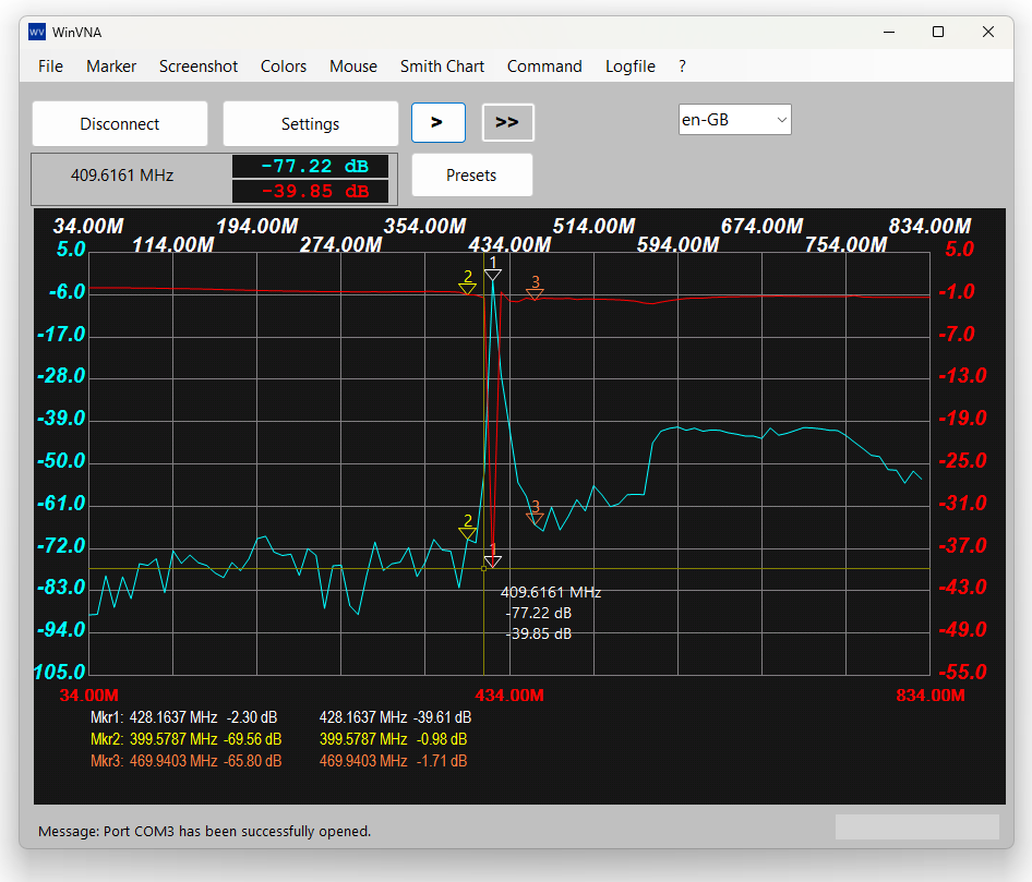 WinVNA, inicialmente programado para el analizador SV4401A, resulta ser totalmente compatible con el nanoVNA-H (adjunto imagen obtenida con este modelo), ya que ambos utilizan el mismo protocolo USB y comparten VID = 0483 y PID = 5740 en modo normal (VCP/serial).
