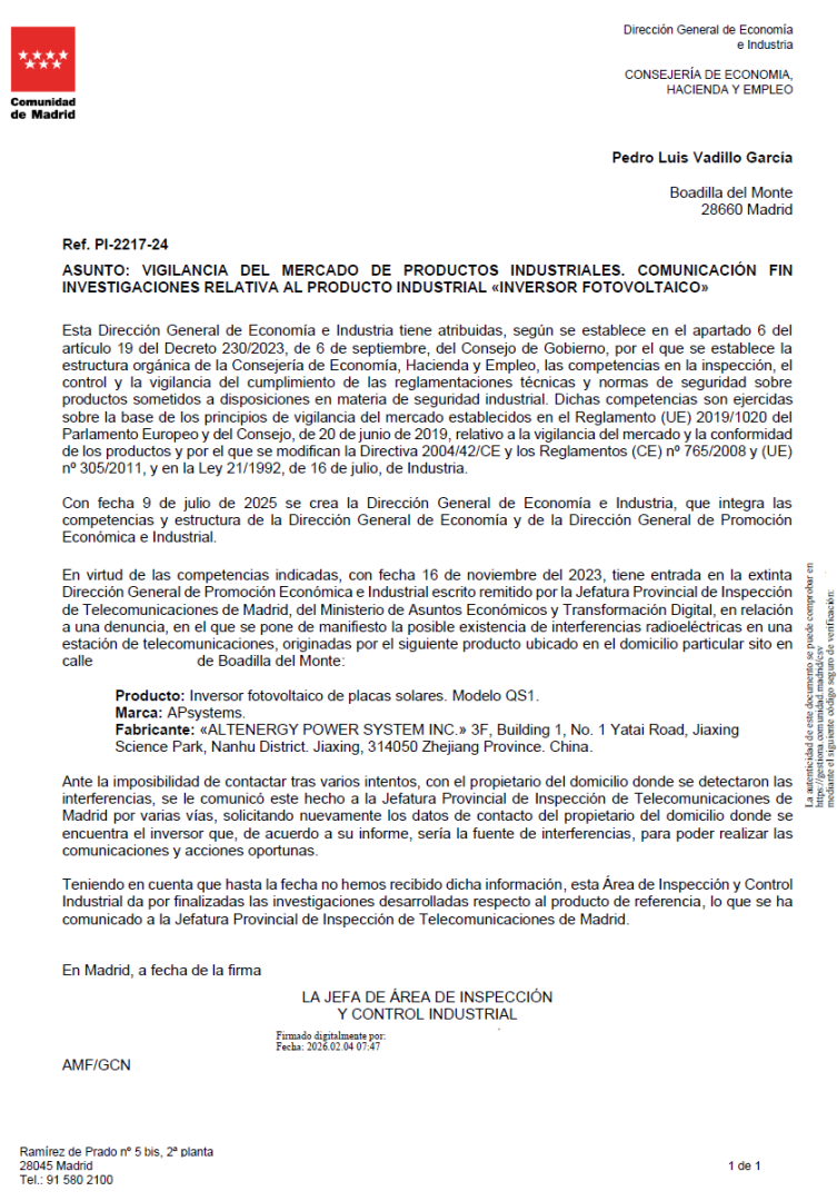 Conseguí que emitieran el informe pero como no es un equipo de telecomunicaciones, “no pueden hacer nada”, lo trasladan a industria de la CAM con este diagnóstico (25/1/22):