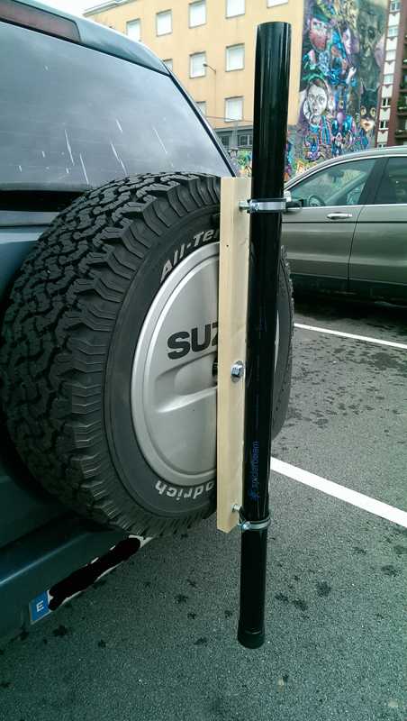 Yo ya lo tenia pensado, pero diferente, yo utilizo un mástil de 13m de aluminio extensible, y pesa muy mucho, quería hacer un soporte igual, pero en vez de agarrarse al tornillo de la tapa Suzuki, quiero que agarre toda la rueda entera, y por supuesto, que apoye en el suelo, ademas, mi coche tiene bola extraible, y hacerle ahi también otro soporte de sujeción. Mi problema es que mi mástil pesa un muerto jejeje, he tenido un par de fibra y se han roto, eran viejos de pesca..........
