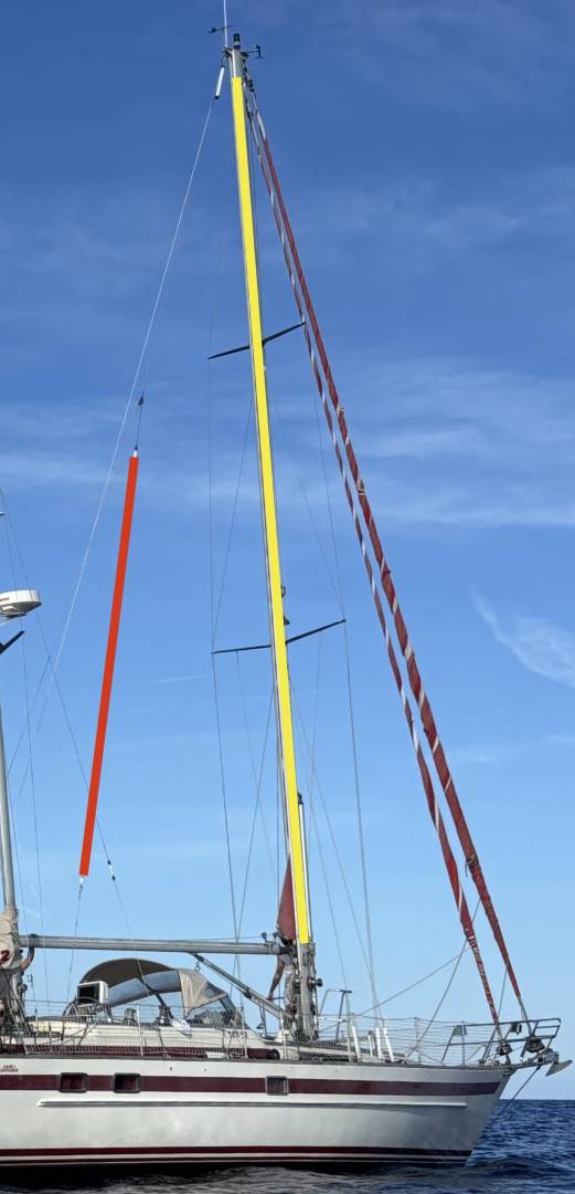 Sino una idea de bombero que he tenido, viendo qué otras secciones de cable de acero tienen aisladores, hay el trozo AMARILLO, que parece de similar longitud, tiene algún sentido plantear algun dipolo con esto? fijaros donde empiezan y acaban los cables, marcan como una X si miras el barco de través.