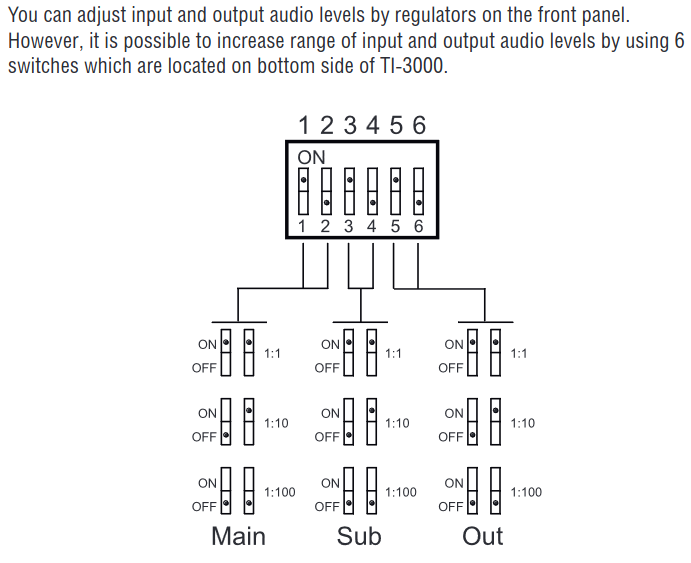 Es decir: en cada uno los 3 "canales" (entrada principal, secundaria y salida) puedes establecer alguna de las 3 relaciones de señal disponibles (1:1, 1:10 y 1:100). Dejar 1/2/3/4 en OFF (abajo) y 5/6 en ON (arriba) quiere decir fijar relación 1:100 en las entradas principal y secundaria y 1:1 en la salida.