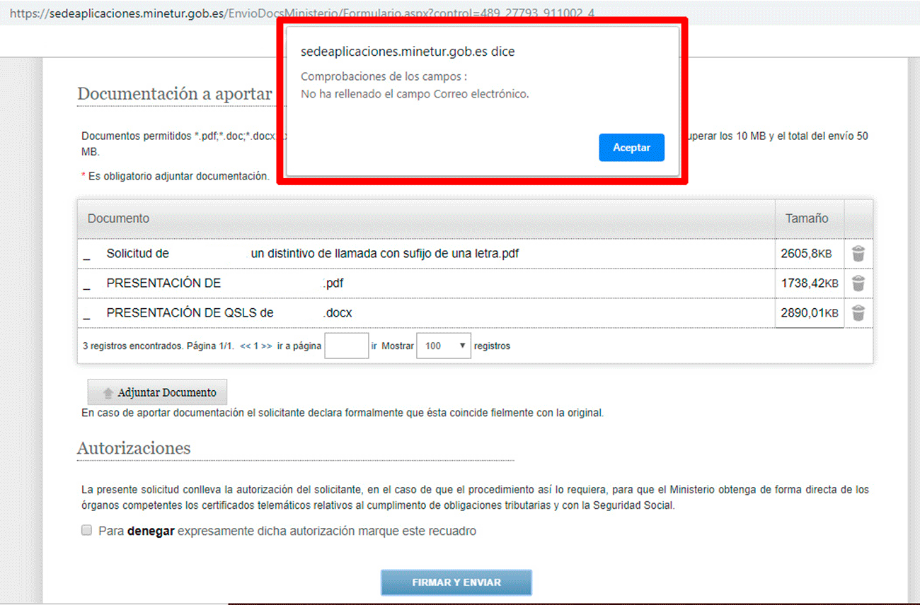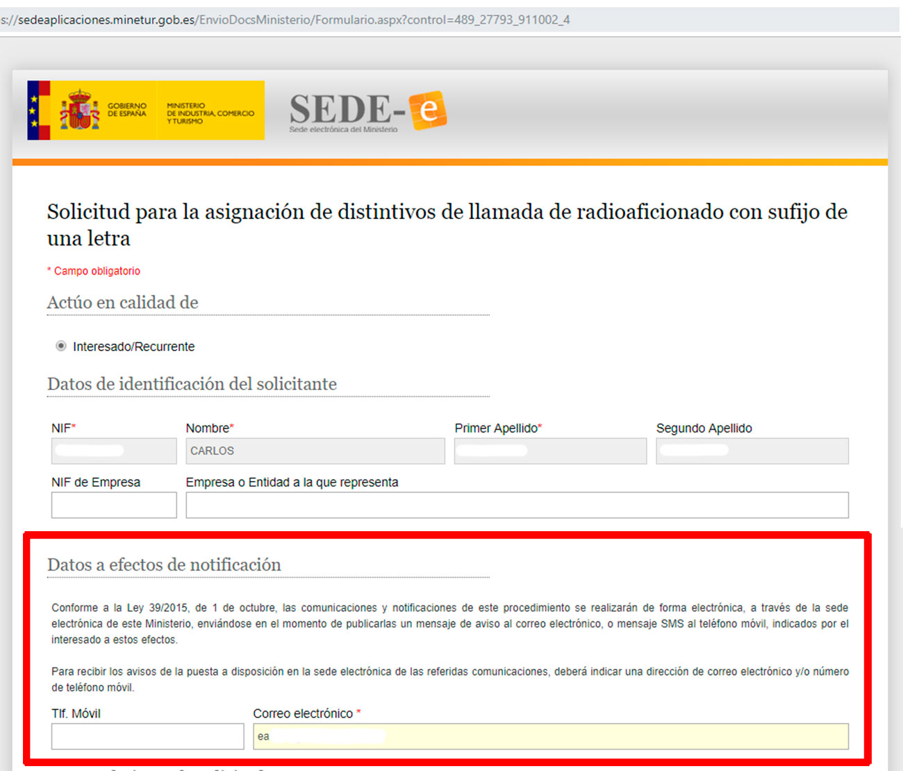 · Ya esta solucionado el tema del CAMPO DE "CORREO ELECTRONICO" EN UN FORMULARIO ADMINISTRATIVO ELECTRONICO POR INTERNET, CUANDO SE REALICE CON CERTIFICADO ELECTRONICO , Procedimiento administrativo para el otorgamiento de distintivos de llamada de radioaficionados con sufijo de una letra.